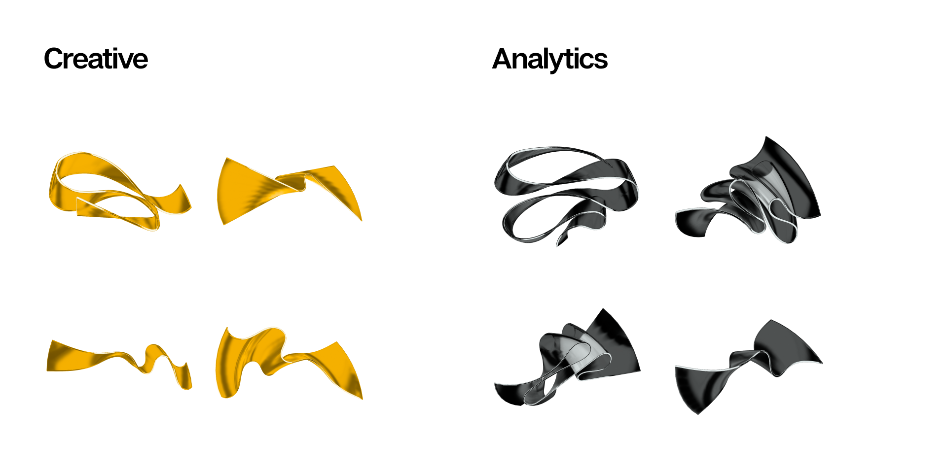 Центральная идея Stik — одновременное существование двух полюсов: Creative и Analytics. Эта дуальность пронизывает каждый слой визуальной системы: