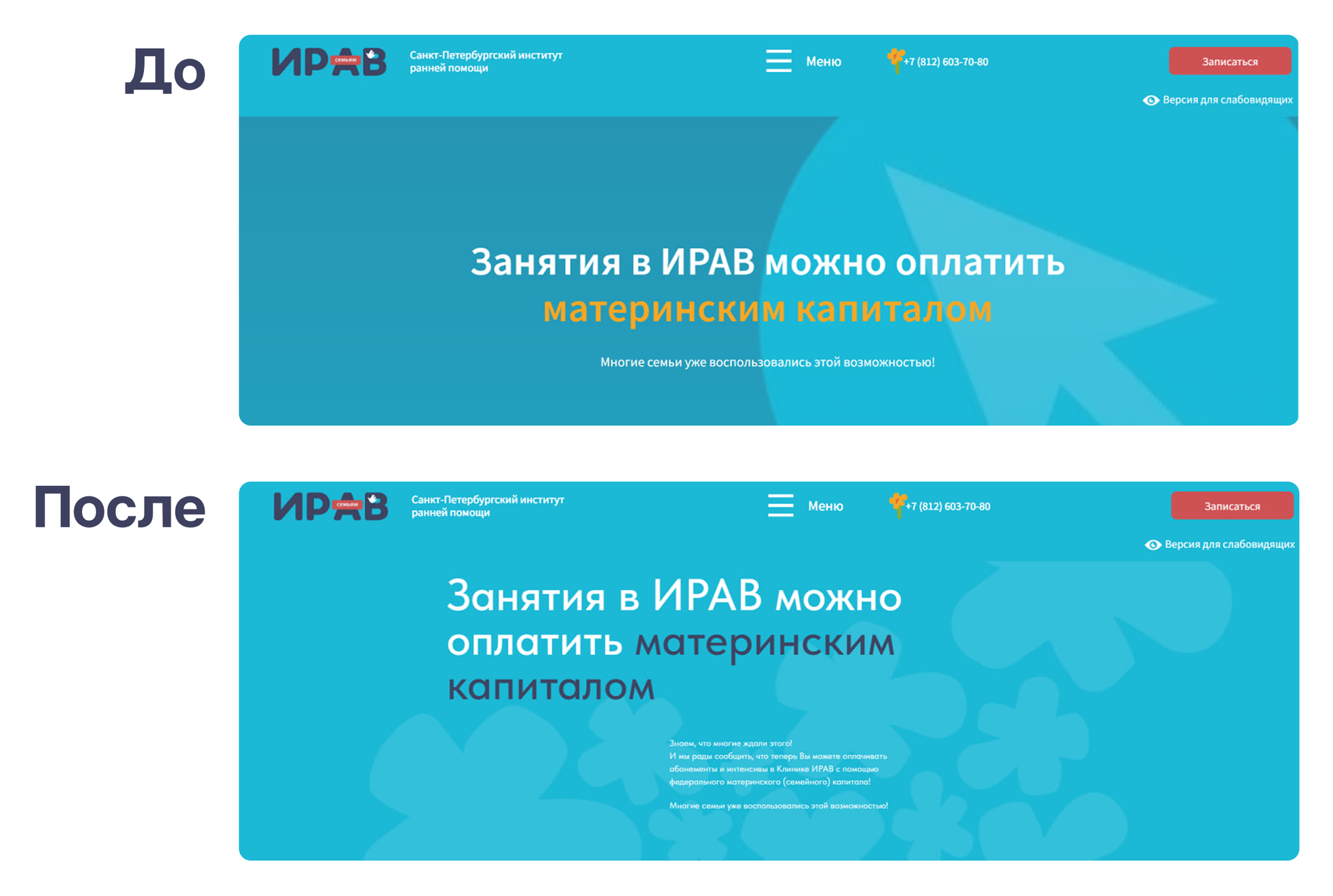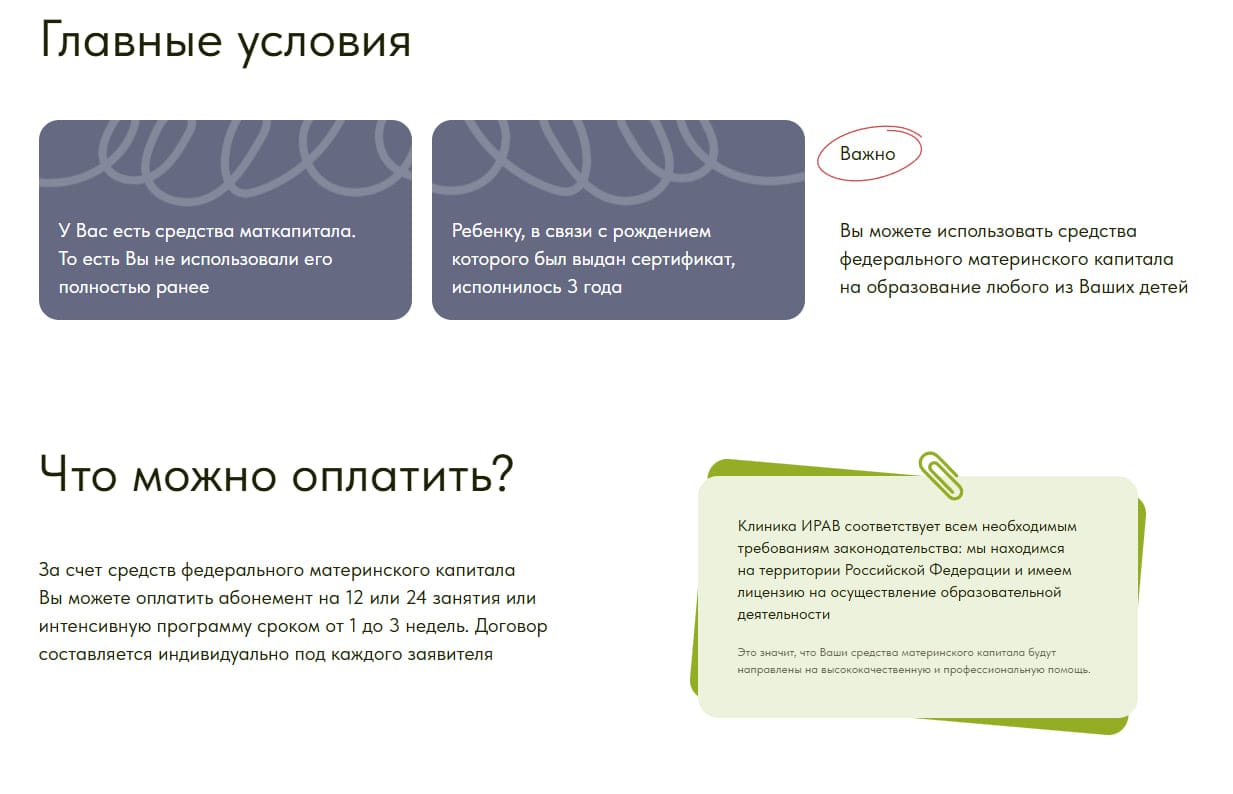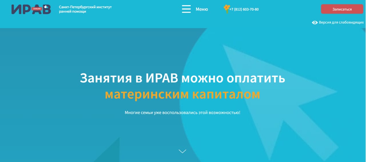 «Институт ИРАВ имеет самый большой в России опыт работы в ранней помощи, и для нас особенно важно, чтобы занятия и диагностики в клиническом отделении были доступны для родителей. Именно поэтому мы приняли решение сделать отдельный лендинг о том, что занятия и диагностики в Институте можно оплатить за счет материнского (семейного) капитала. Сайт стал удобной платформой, на которой родители могут узнать о возможности использования маткапитала на помощь ребенку, а также порядок обращения и сроки рассмотрения таких заявок», — рассказывает исполнительный директор АНО ДПО СПб ИРАВ Евгения Ермолаева.