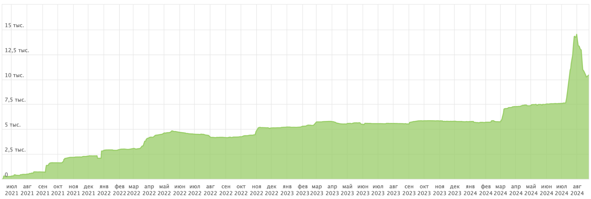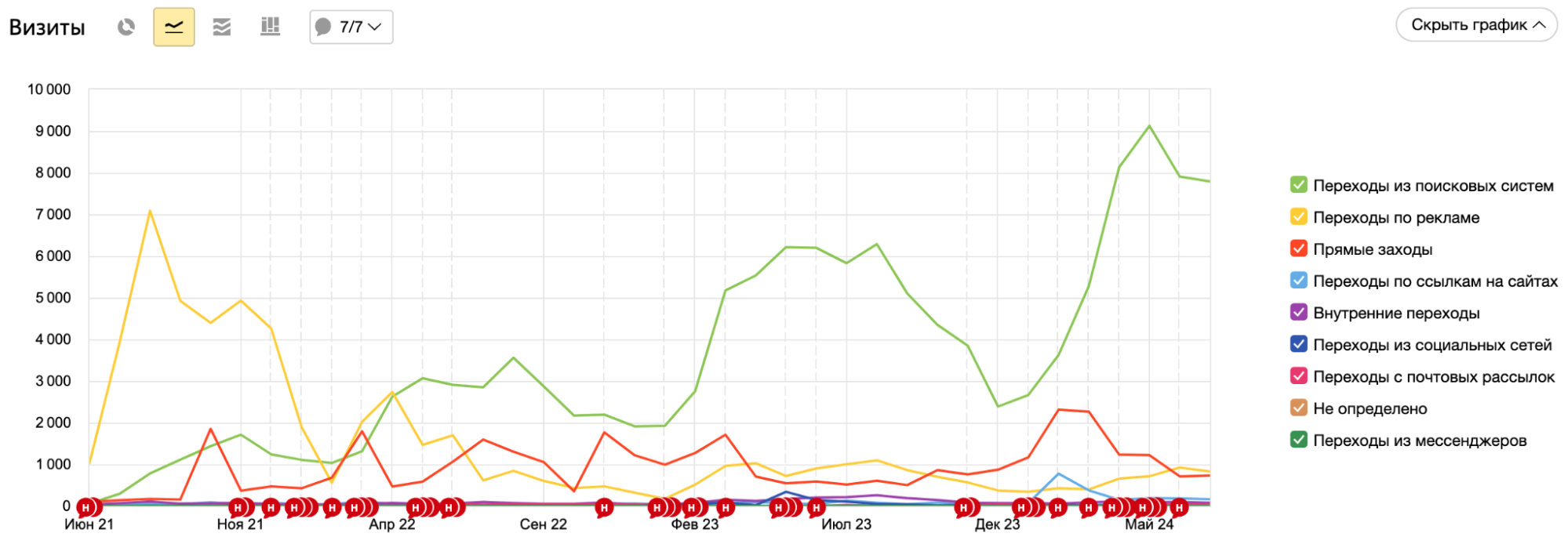 Мы начали работать с клиентом ещё в феврале 2021 года. За 6 месяцев работы мы получили рост позиций в поисковых системах и рост SEO-трафика. Но ниша резиновой крошки имеет сезонность — в холодный период с конца осени и до конца зимы работы по укладке на улице невозможны. Поэтому клиент решил приостановить сотрудничество на время с ноября 2021 года до марта 2022 года, за это время трафик просел.